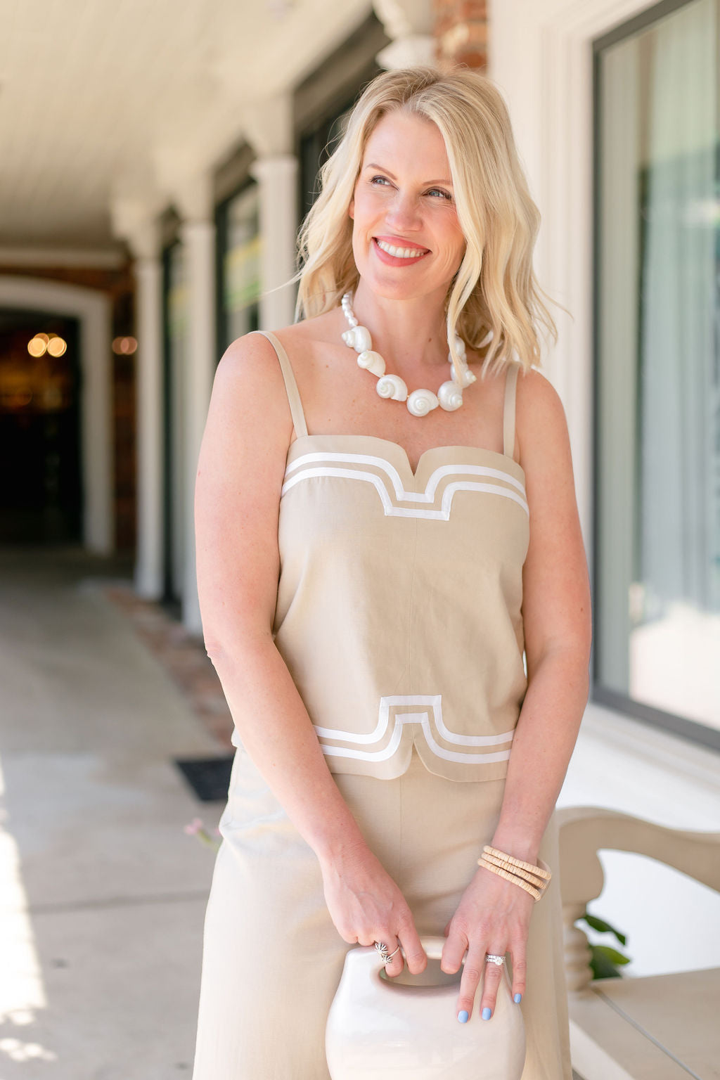 Feel the sun on your skin in this sleeveless top with a cami style and adjustable straps. This casual top's cobalt stretch linen and contrast trim give a nod to nautical, making it perfect for days by the water.