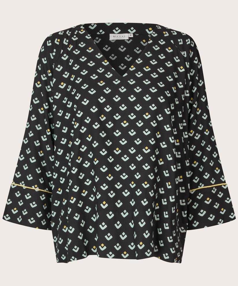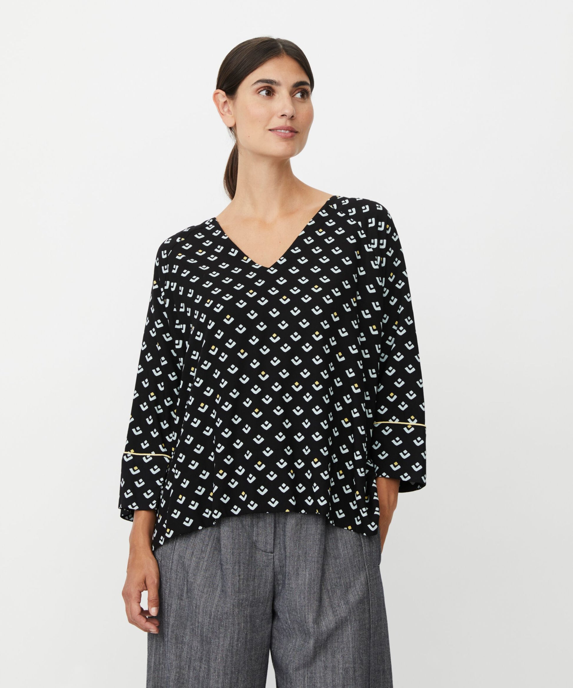 Blend comfort and style with this beautiful, casual top. The soft viscose falls effortlessly and luxuriously, while the graphic print and delicate yellow details give it a playful twist. Featuring a flattering V-neck, short side slits and an oversize cut, the top offers an effortless, elegant look. Style it with high-waisted trousers and a narrow belt for a feminine, cool look.