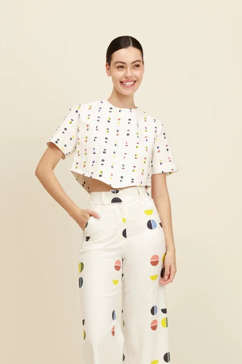 Short cut with an original touch. A triangular hem, striking sleeves, and a '70s-inspired circular print make it stand out.