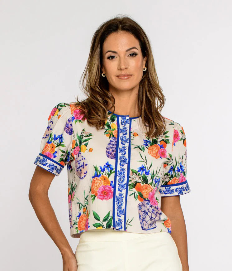 Our Coco is a darling button-front top silhouette that can also be worn as a jacket. With puffed sleeves and decorative trim, she is the sweetest wardrobe addition for the summer season.