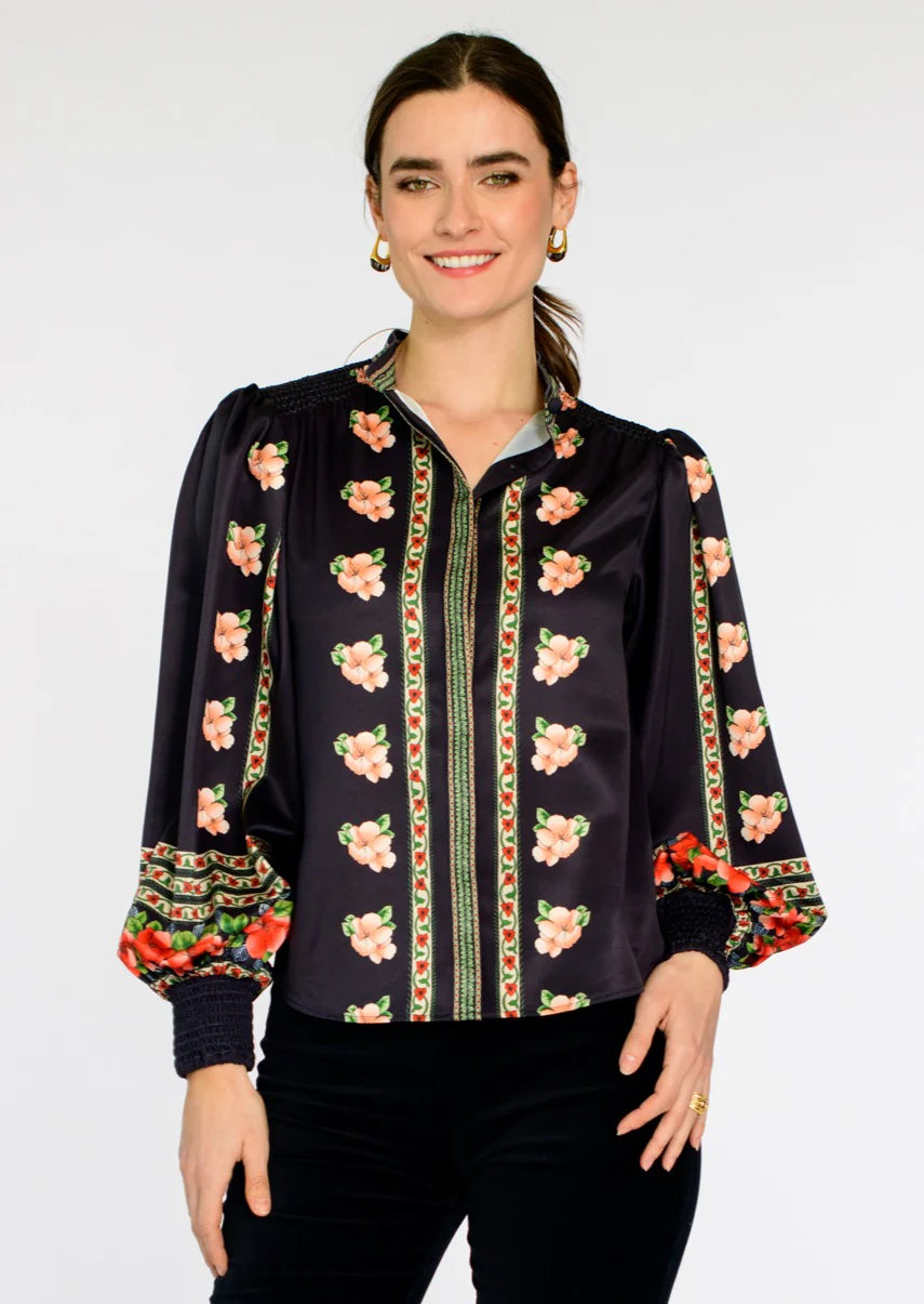 The Emily Top is the perfect button front blouse, featuring a mandarin collar, covered placket, and balloon sleeves. This season, she is cut from a soft satin fabric in our Garland Stripe print, great for dressing up or down this season.