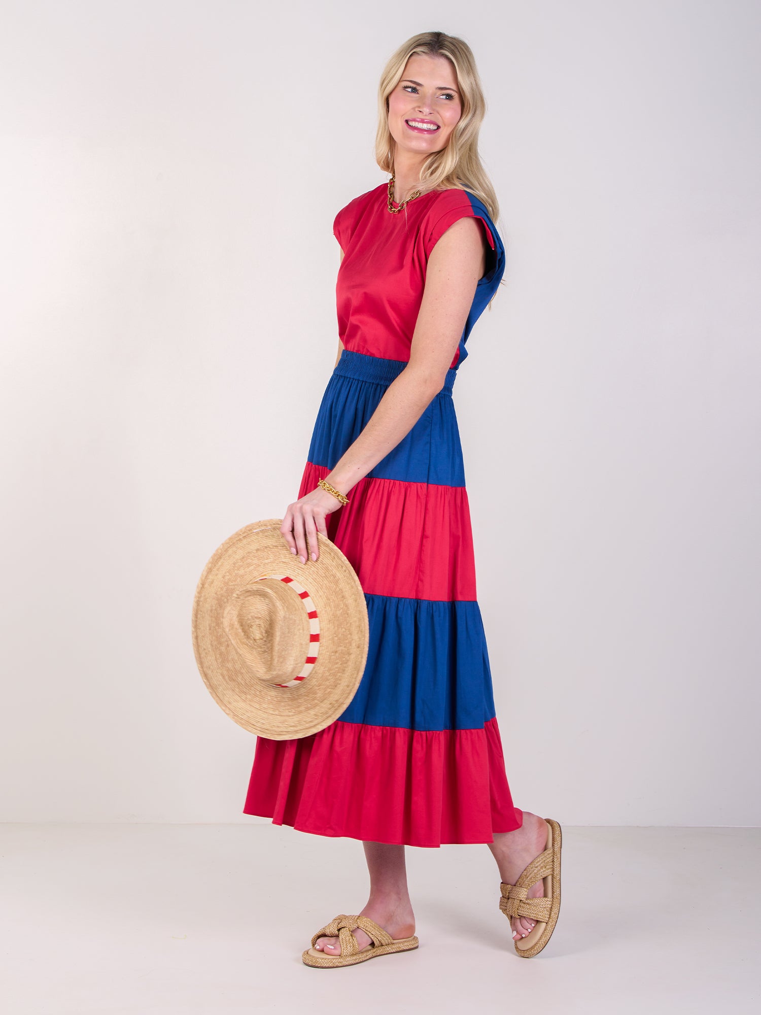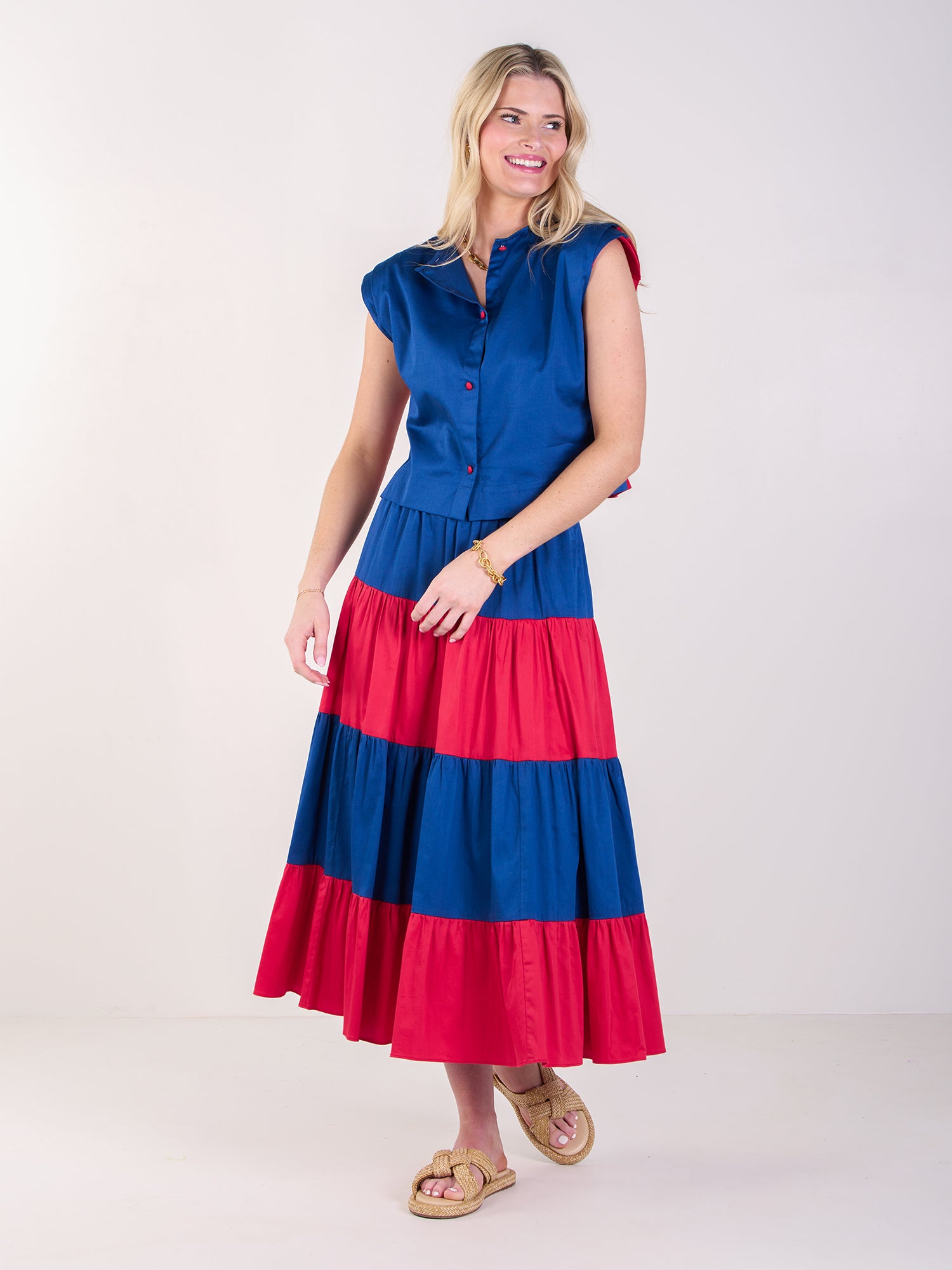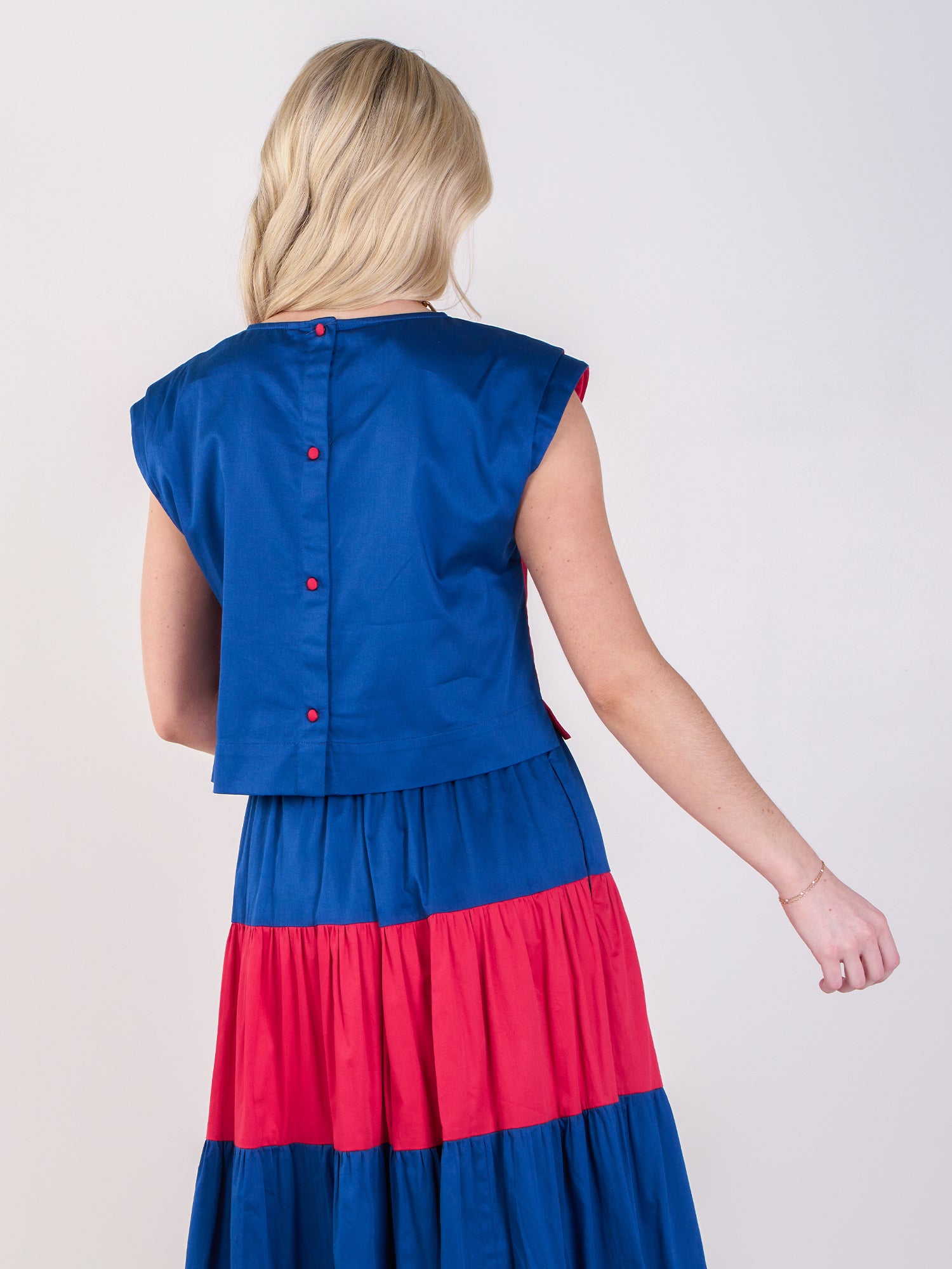 Introducing the Hatti Tank in Americano, a bold, modern staple designed to turn heads. Crafted from crisp cotton poplin, this structured top features a cropped, boxy silhouette with padded shoulder sleeves and refined back covered buttons. The striking red front meets a deep blue back for a color-blocked moment that radiates patriotic flair. Whether you're styling it for Fourth of July festivities or simply embracing a spirited summer palette, this tank pairs effortlessly with the coordinating Tiered Maxi skirt for a look that transitions seamlessly from day to night. Elevated, effortless, and ready for celebration.