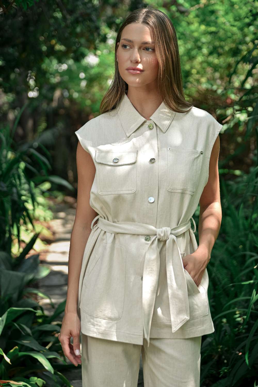 The Jeffery Vest is a tailored sleeveless vest crafted from a lightweight woven fabric, featuring a classic collared neckline and button-front closure. Designed with functional flap chest pockets, subtle side pockets, and a removable self-tie belt to define the waist. Clean, versatile, and easy to layer for a polished everyday look.