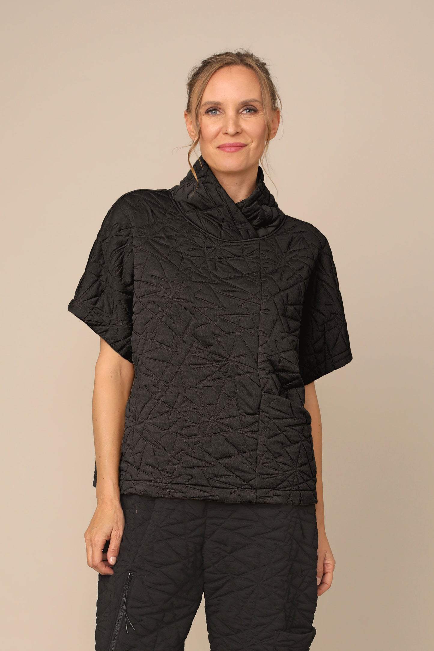 Soft structure meets exquisite charm. The Jianna Top carries dolman short sleeves with an overlapping mock neck and patch pocket in a straight hemmed boxy silhouette. Crafted in plush textured puff jacquard that feels as inviting as it look