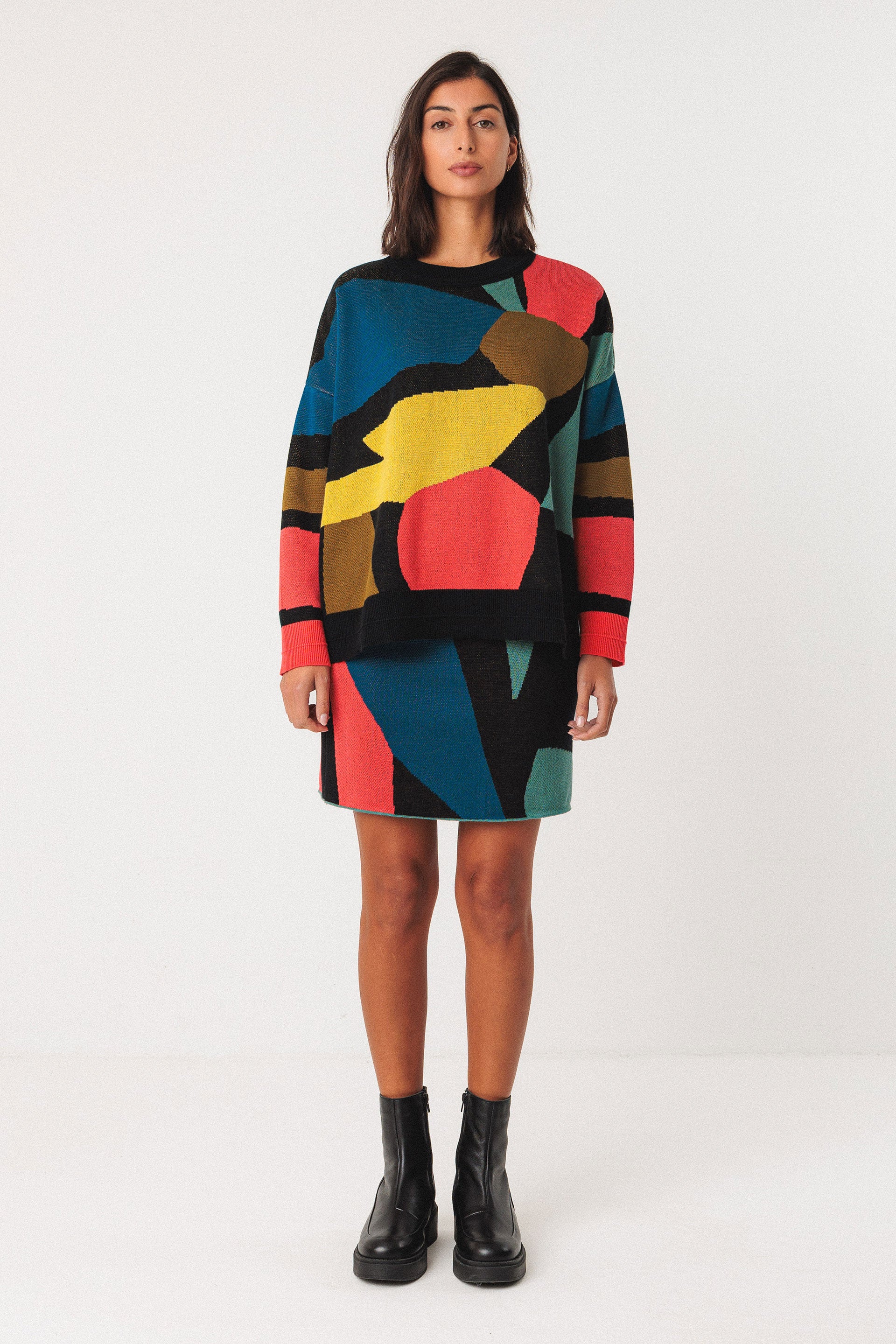 Midweight jacquard sweater with a round neck. It has long sleeves and ribbed trim at the collar, hem and cuffs.