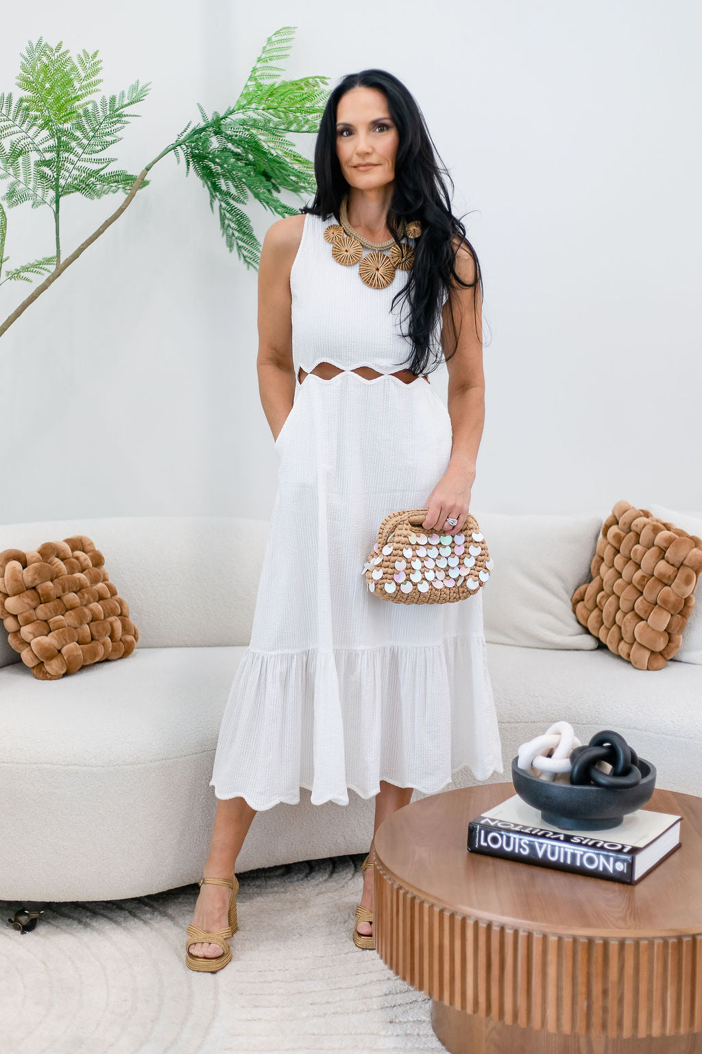 Introducing The Lina Dress in White Seersucker, perfect for warm sunny days! Featuring a sleeveless design, playful cutouts at the waist, an elastic back, and a flattering flutter hem.