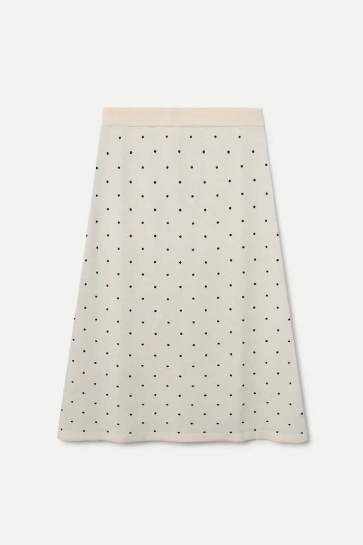 White jacquard midi skirt with black mini dots. Elastic waistband and mid-rise. The model is 177 cm tall and is wearing a size S.