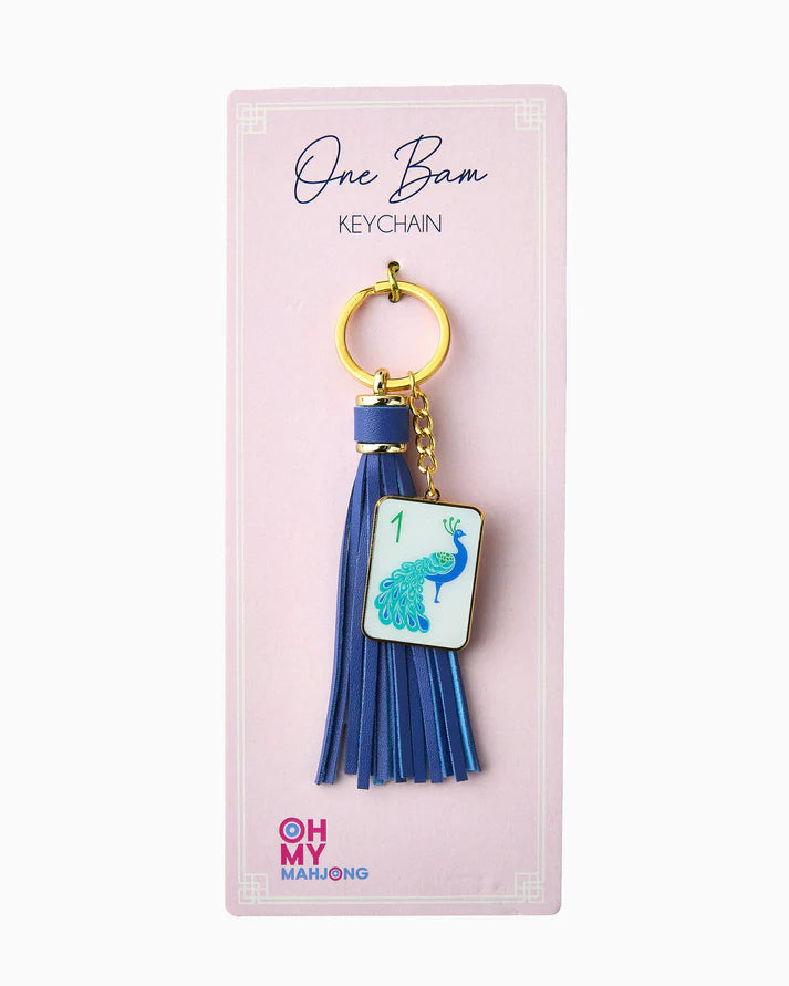 Turn heads with our One Bam Keychain, modeled after the iconic bird bam tile. Crafted with detailed artistry, this keychain showcases the intricate one Bam design, complete with a bold tassel to match its vibrant blue hues. Lightweight and eye-catching, it's the ideal accessory for adding a little mahjong magic to your day. Keep your keys organized or clip it onto your favorite bag to flaunt your unique style with a nod to tradition and fun.
