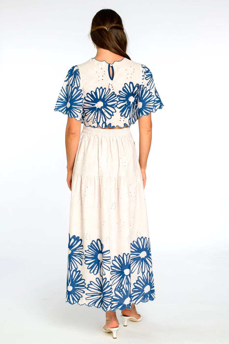 Paloma is perfect for pairing with your favorite skirts and shorts. She features chic elbow length sleeves and a waist length hem, both finished with navy scallop embroidery edges. Wear her as a set or with your favorite high waisted white jeans this season.