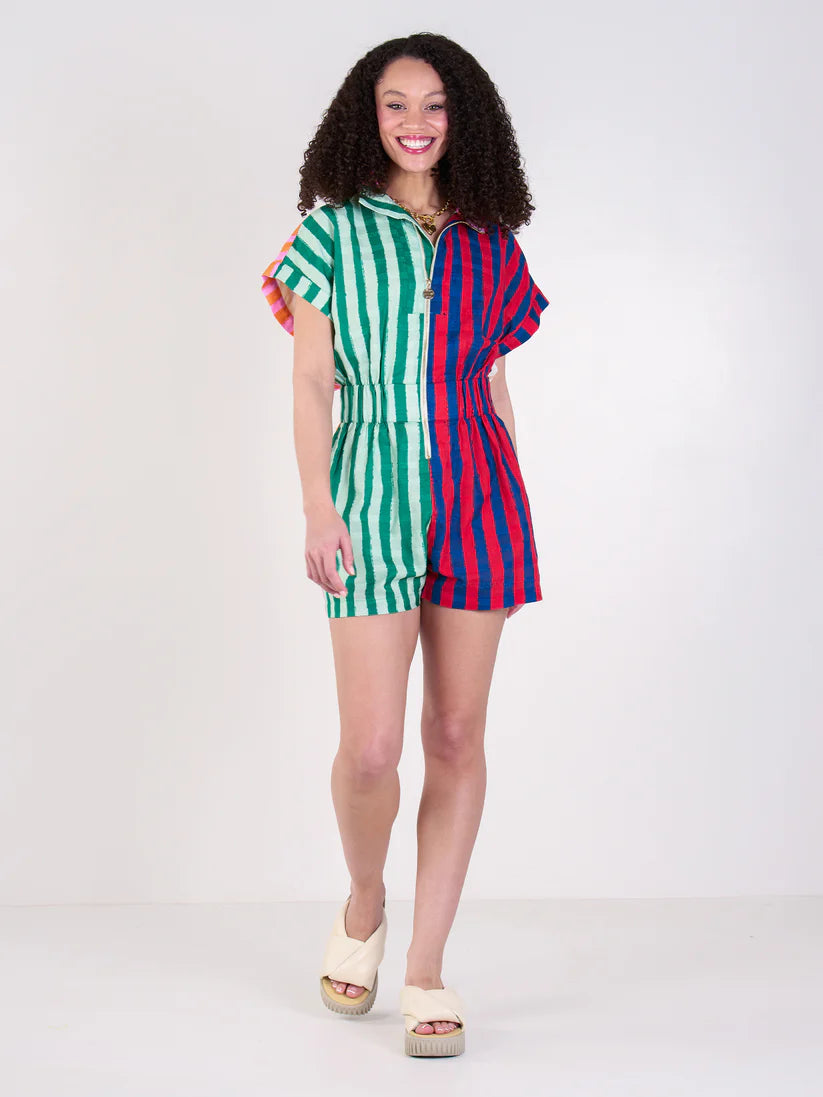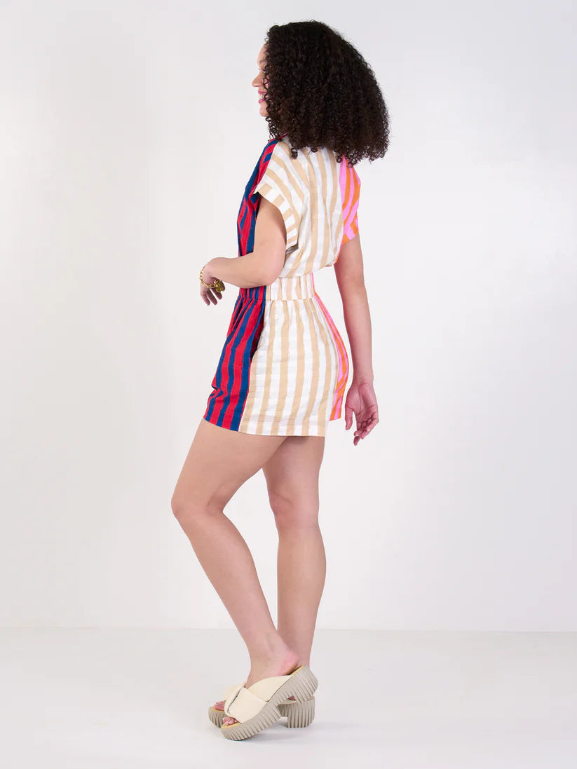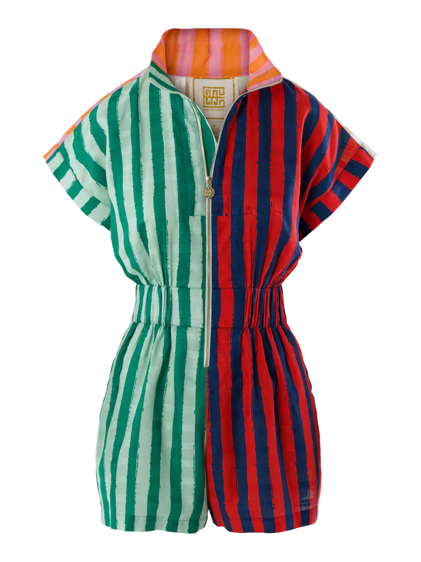 The Poppy Romper in Stripe Mix brings playful personality and effortless polish to your summer wardrobe. Designed with a classic stand collar, short dolman sleeves, and a flattering cinched elastic waist, it features a front zip closure finished with our signature gold logo pull. Side pockets add easy functionality, while the color-blocked design showcases a mix of bold stripes from the collection, making your favorite print choice a little easier. Vibrant, versatile, and full of charm, this romper is ready to go wherever summer takes you.