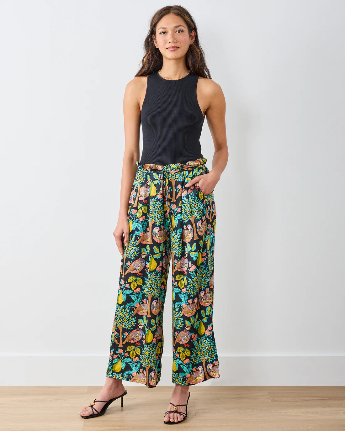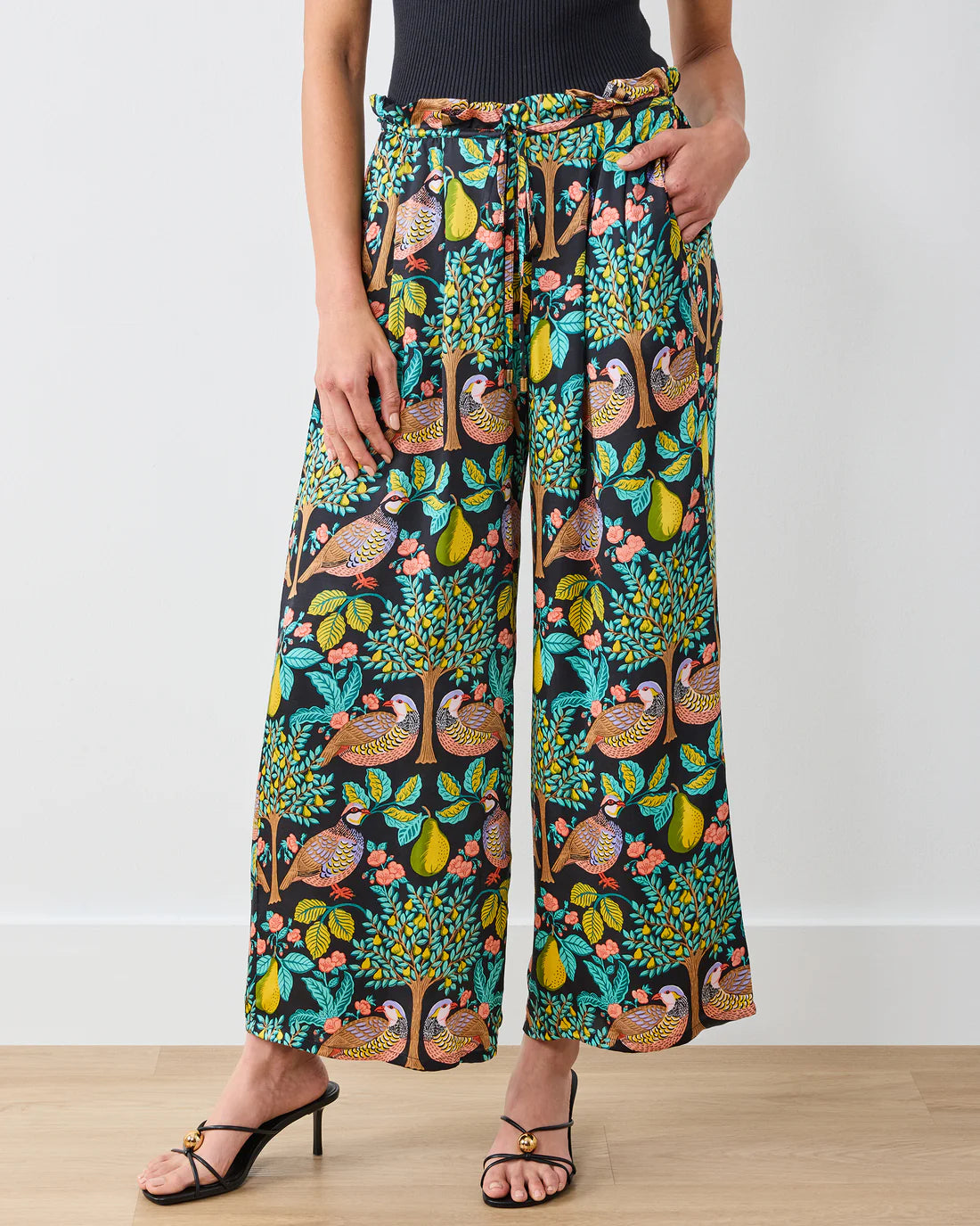 Celebrate the season with our Rowan holiday lounge pants. Featuring graceful birds amid pear-filled branches, these festive print pants are crafted from soft modal with a luxurious sheen that drapes beautifully. The flowy wide-leg silhouette and deep pockets make these elegant trousers perfect for holiday movie marathons and Christmas morning lounging.