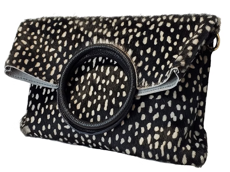 Introducing the Saveria Handbag, a luxurious medium-sized accessory crafted from genuine cowhide fur. With its elegant circle handle, it easily transitions from a chic handbag to a stylish over-the-shoulder purse.