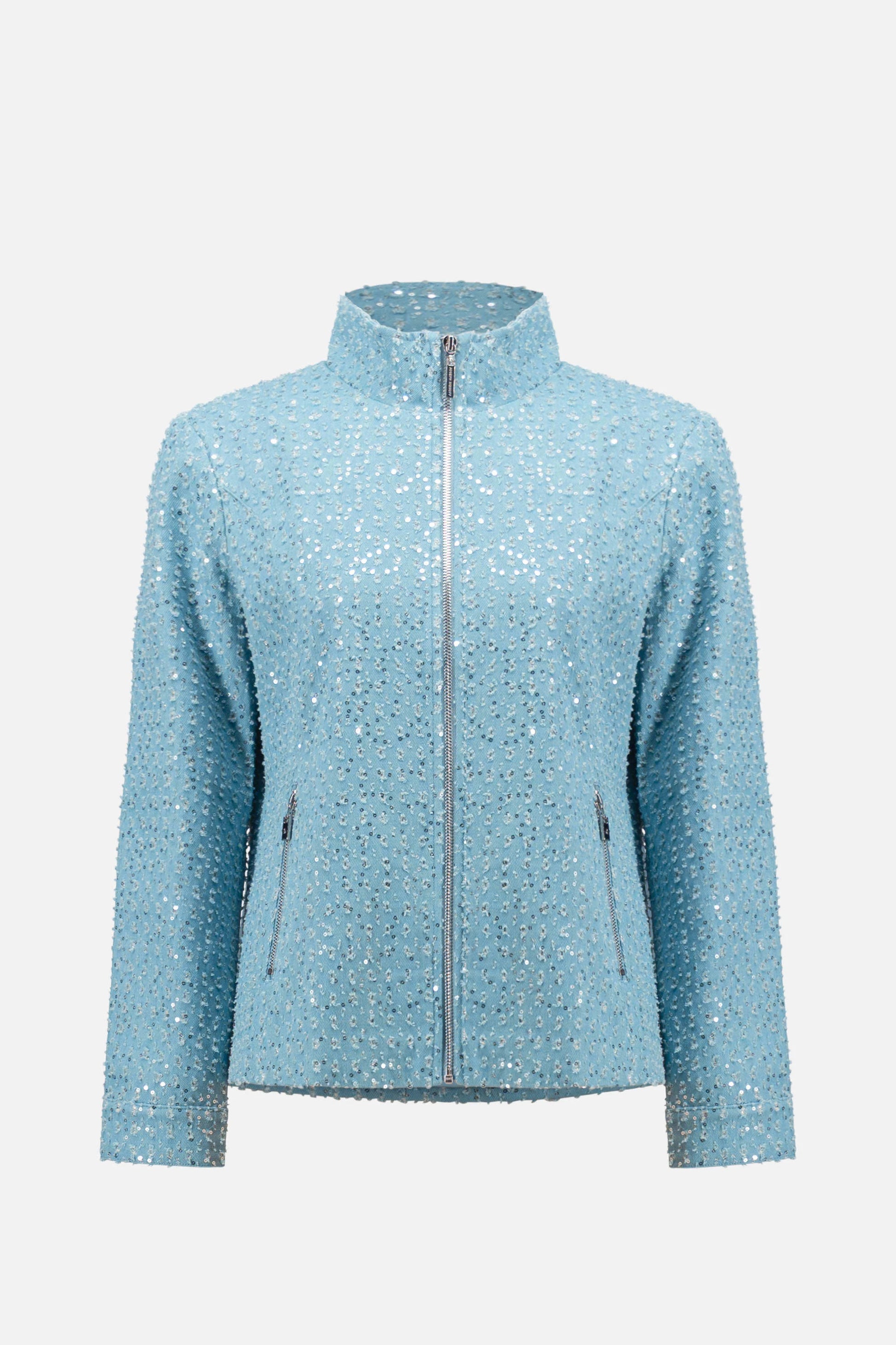 This isn’t your average denim jacket: covered in allover sequins with a bold exposed front zipper and stand collar, it’s designed to shine from every angle.