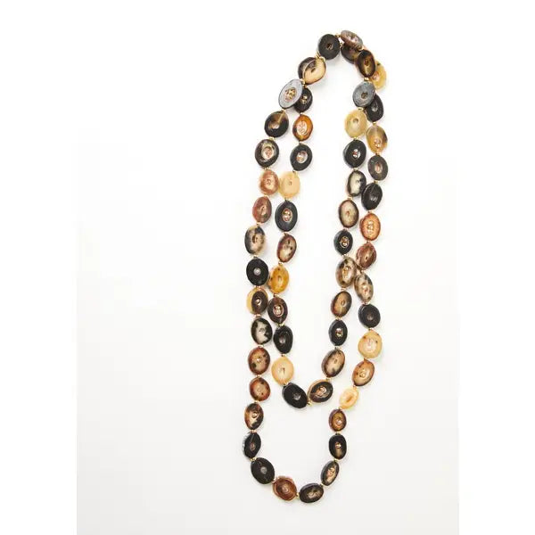 Our Toro Necklace is a fabulous, long necklace that can be worn doubled, or tripled around the neck. It's handmade of natural horn, glass crystal, and gold beads.