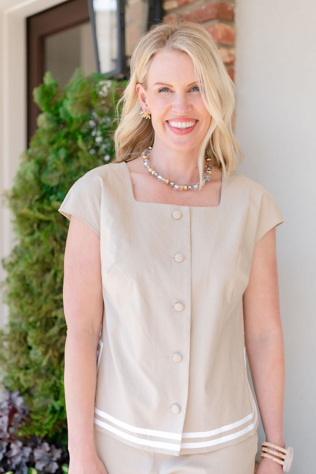 Stay cool on warm days in this casual top. Featuring a cap sleeve, square neck, center front buttons and contrast trim at the hem, this nautical-inspired top is crafted in cobalt stretch linen for ultimate comfort. Pair it with our matching pants or shorts to complete the look.